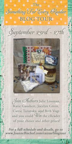 Thanks for visiting us on the “A Book For Every Reader” blog tour! Leave a comment below to be entered to win not one but TWO books! One of Joanne’s and one of mine: Widow of Gettysburg. (Click the book covers for more information on each story.) Also, to enter in the grand giveaway prize which includes some country goodies and an e-reader, simply hop on over and fill out the entry form: http://www.joannebischof.com/extras/blogtour/ You’ll also find the official details. Winners will be drawn on September 28th and contacted via email. Thanks for joining us!